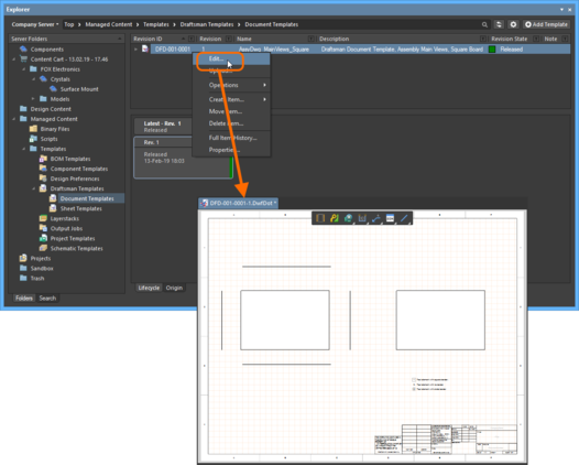 And at any stage, you can come back to any revision of a supported Item in Concord Pro, and edit it directly. Simply right-click on the revision and choose the Edit command from the context menu. Once again, the temporary editor will open, with the entity contained in the revision opened for editing. Make changes as required, then commit the release of the document into the next revision of the item.