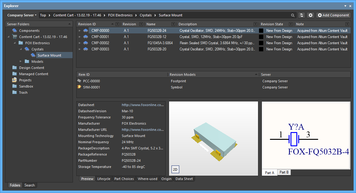 From within Altium Designer, component management is streamlined through use of the Components panel and Manufacturer Part Search panel. However, another interface to your Altium Concord Pro installation is the Explorer panel. From this panel you can perform many activities, including: