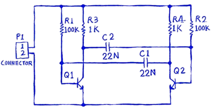 The design you will be capturing then designing a printed circuit board (PCB) for is a simple astable multivibrator. The circuit – shown to the left – uses two general purpose NPN transistors configured as a self-running astable multivibrator.