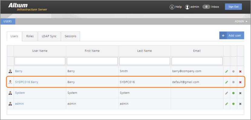 User name details and sign in credentials are listed and defined in the User Management page (under the Users tab) of the Server’s browser interface. User entries that are listed in the User Management page are of different types, and are automatically or manually created as follows: