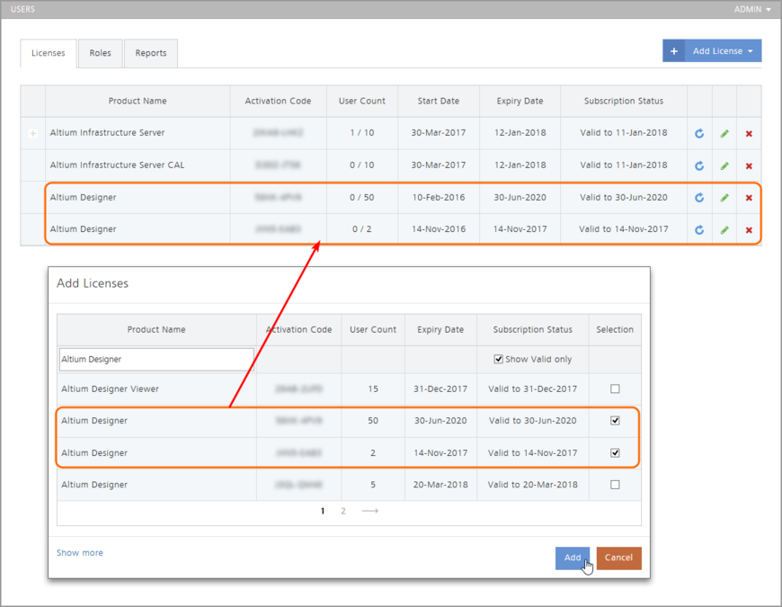 Licenses for other Altium software products are acquired through the Server’s License Management page, as outlined in the Acquire Licenses section above. When connecting to the online Altium License Service (via its portal) for example, the Add Licenses dialog list will include all licenses that are available to your company, which depending on the licenses needed, can be selected via their associated check boxes and added (downloaded) to the AIS.