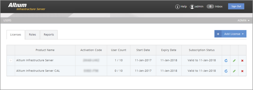 The imported licenses will then be listed and registered in the Infrastructure Server's License Manager page. To activate the server's full range of functions, sign out and then sign in again.