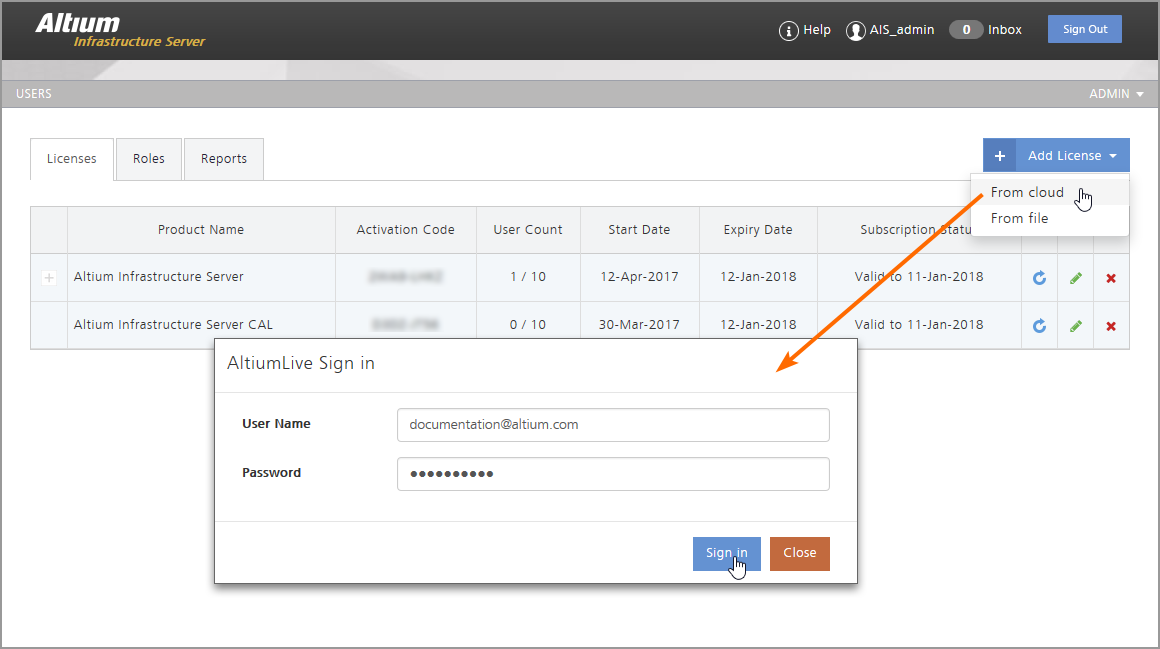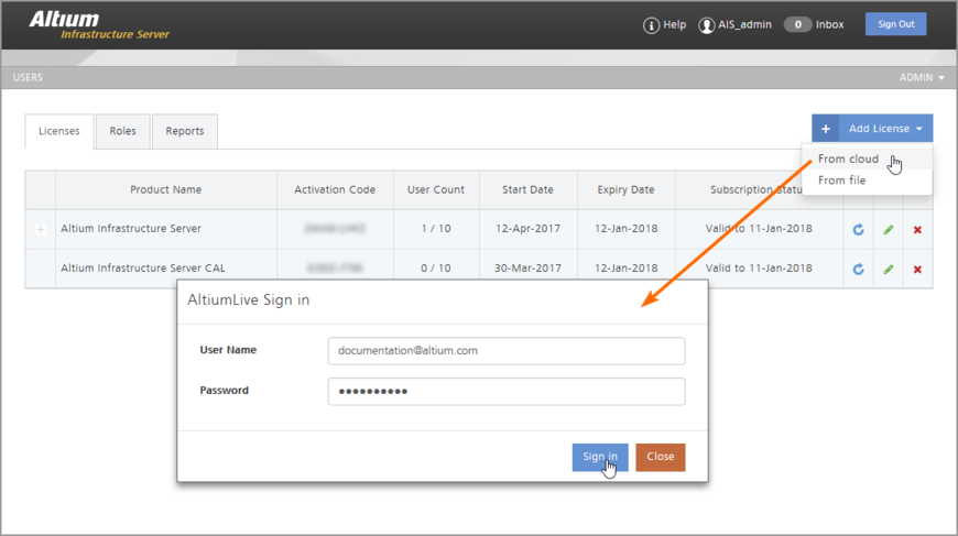 The first step to managing and distributing Altium software licenses to workstations on the network is acquiring those licenses from Altium's cloud-based License Server, via the AltiumLive portal. This is performed through the server's License Manager page, from the From Cloud option of the