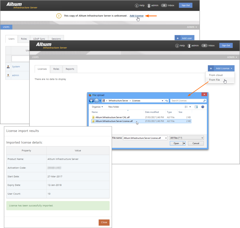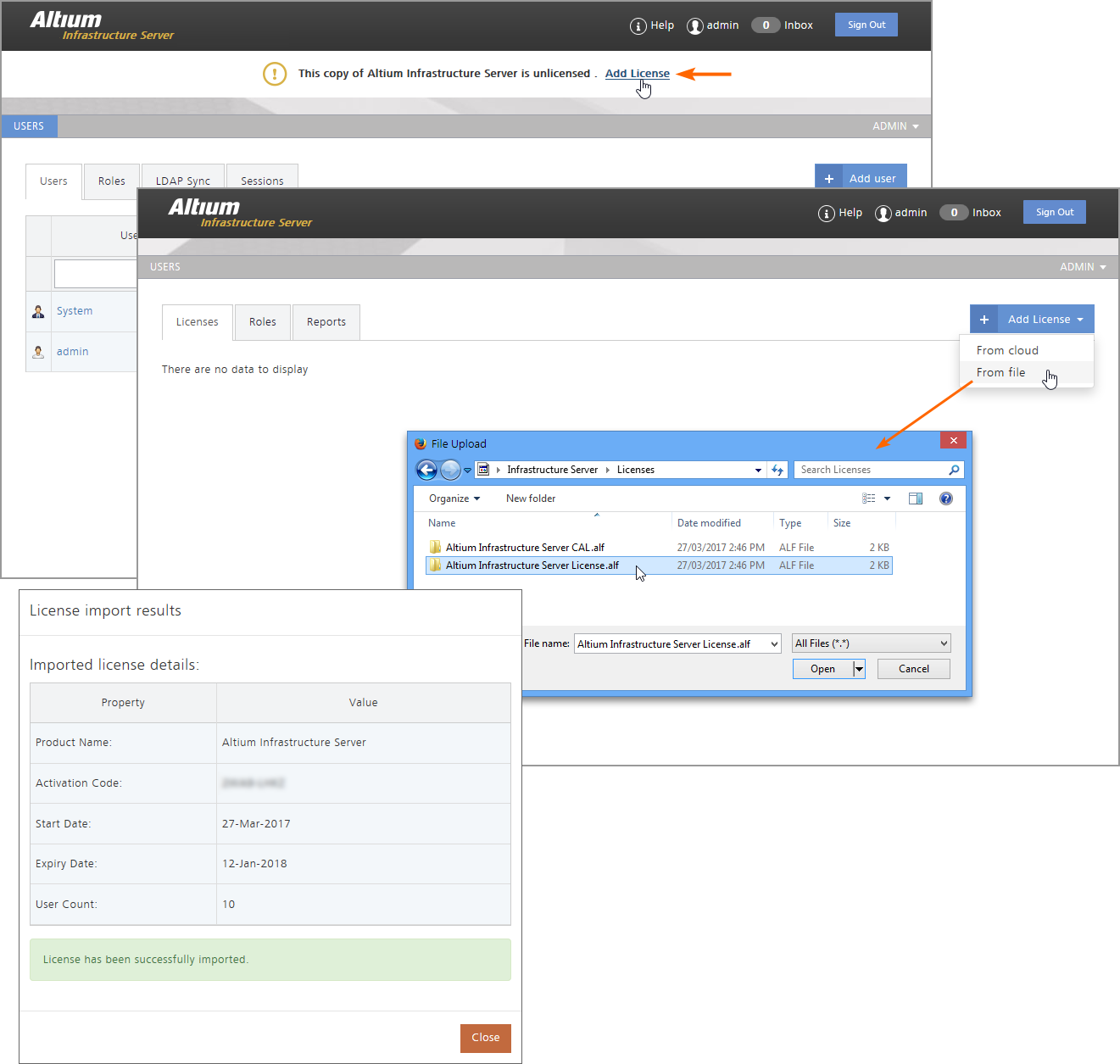 Select the From file option to import the license files for the Infrastructure Server, such as those included in the downloaded installation zip file. Browse and locate the applicable license files (*.alf) and upload these to the Server. The server requires two license types for full functionality: