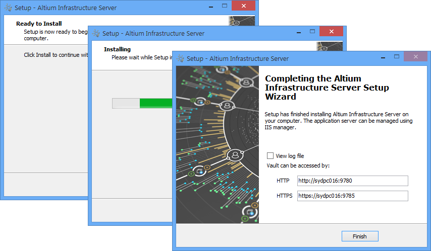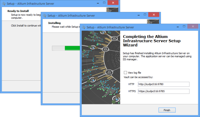 The Infrastructure Server requires Altium Licenses to activate its features and allow network connections. The required licenses files are available within the downloaded zip file as discrete license files (*.alf), and are activated by registering them with the server via its browser interface, which is accessed via the web addresses (based on the host PC's name) shown in the install wizard's completion dialog, as shown above.