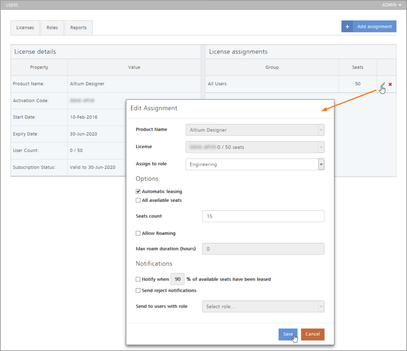 The Edit Assignment dialog allows the configuration of license Role assignment, Leasing Options, Roaming settings and User notifications. In the below example, the License has been assigned to the Engineering Role, and set for the automatic leasing of 15 of the available 50 license seats. Both license Roaming and Notifications are disabled here.