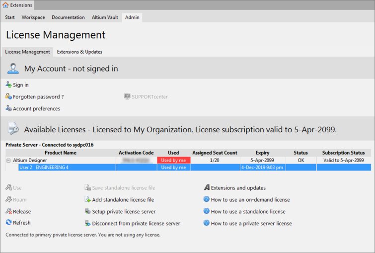 Note that in this example the Altium license was assigned to the Engineering Role with the Automatic leasing mode selected – see above. When that option is not enabled in the AIS license assignment, the License Management page in Altium Designer will simply list the license under Available Licenses, and require you to select its entry and then the Use link to lease (use) the license.