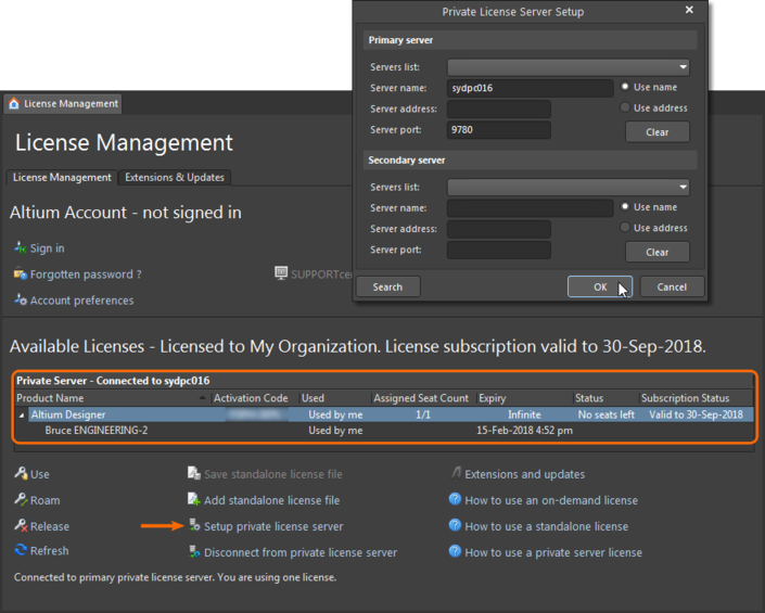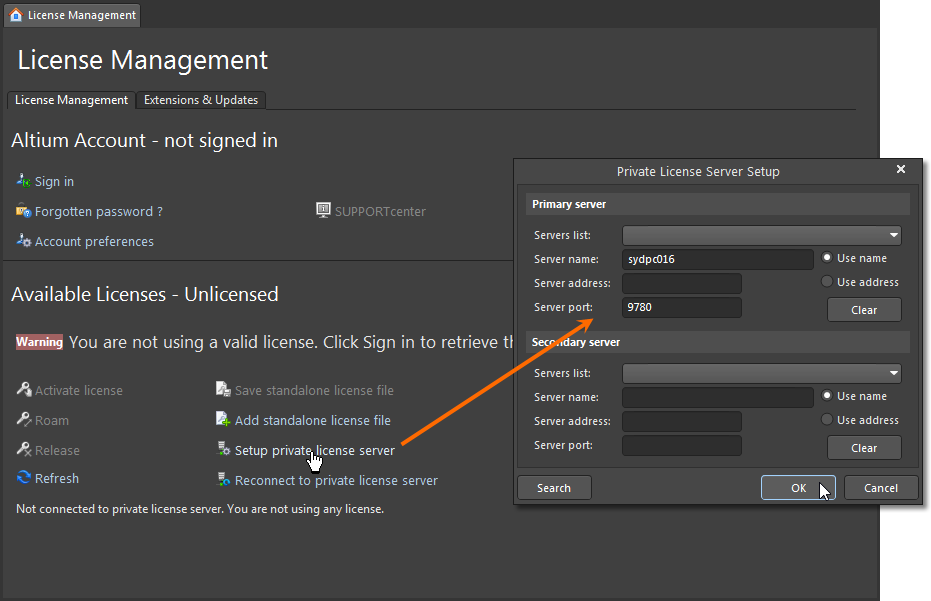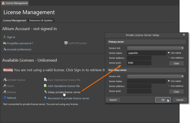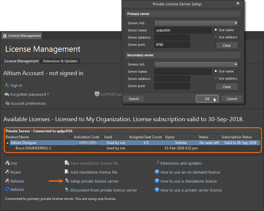 A connection is normally made to the AIS by virtue of the internal PLS connection feature available in Altium design software. The license connection feature is manually configured in the software's Private License Server Setup dialog, which is opened from the Setup private license server link in the License Management page – accessed by selecting the Licenses option from the User account drop down menu (upper right). Only the AIS server name (in practice, its host PC's name) and its active port are required.