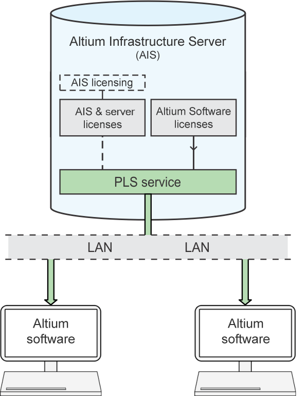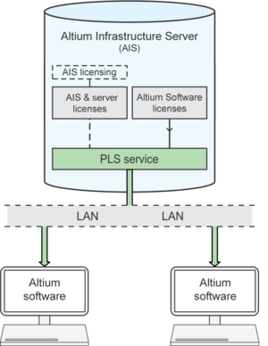 The Altium Infrastructure Server’s Private License Service (PLS) serves its hosted licenses over the network to Altium software workstations, as determined by the license Role assignments and seat availability. Note that the AIS also offers the potential to serve suitable licenses to Altium Servers that exist on the network, such as offline servers located in different departments.