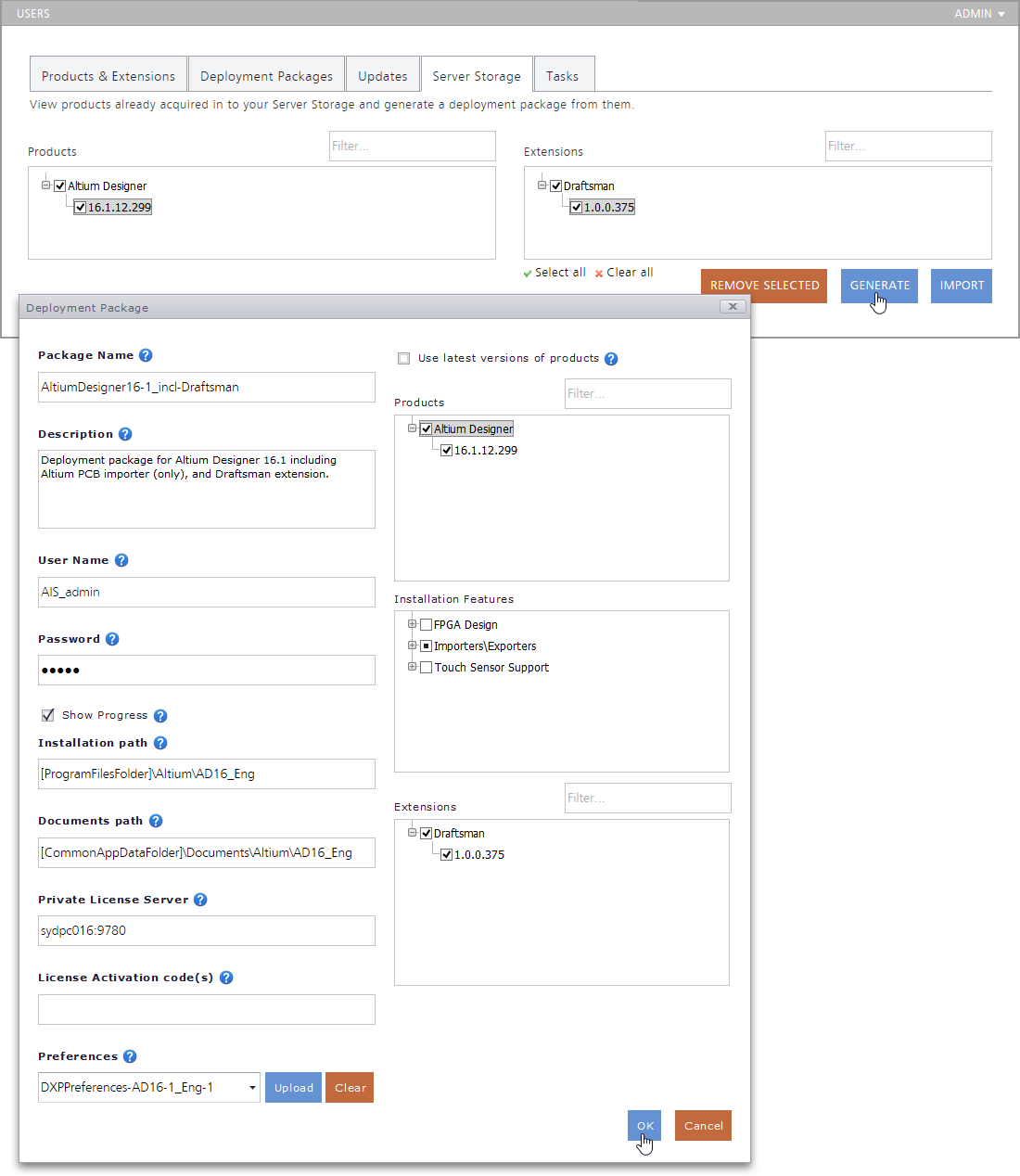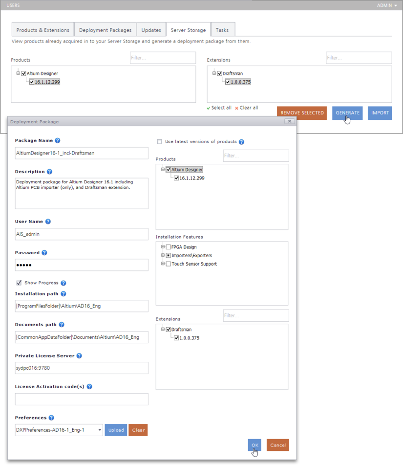 In the example deployment package configuration shown above, the entries in the Deployment Package dialog are arranged to create an installer for Altium Designer 16.1 that will include one file importer (Altium PCB) and the Draftsman extension. The install paths are set to typical locations on the target hard disk, and access to the product files in the Infrastructure Server is gained with the credentials of AIS_admin. An uploaded Altium Designer Preferences file is also included to automatically configure Altium Designer, once installed.