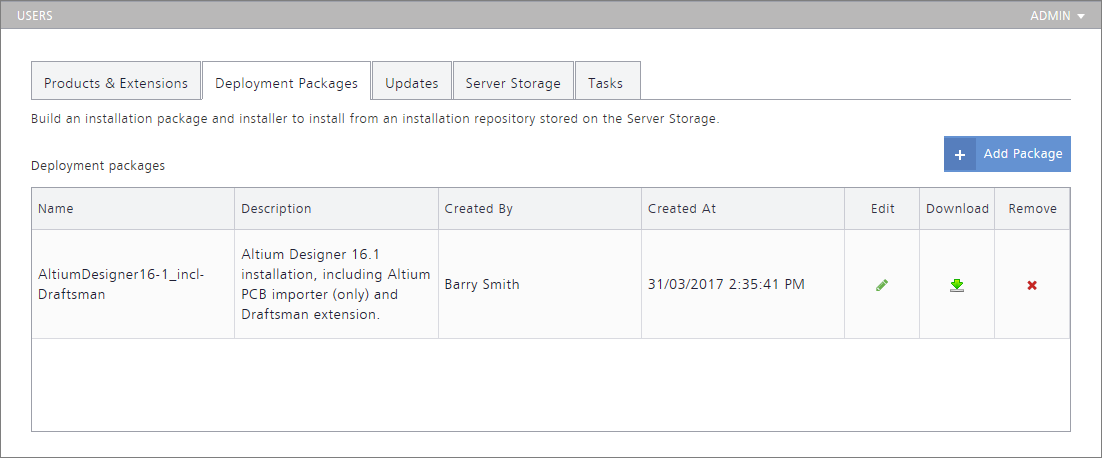 In practice, an Infrastructure Server administrator uses the NIS capabilities to acquire software product files from Altium, and then assemble these into a configurable software deployment package. The locally stored package can then be deployed to networked workstations as a software installer executable (*.msi), or as a direct installation using Microsoft’s Active Directory Group Policy.