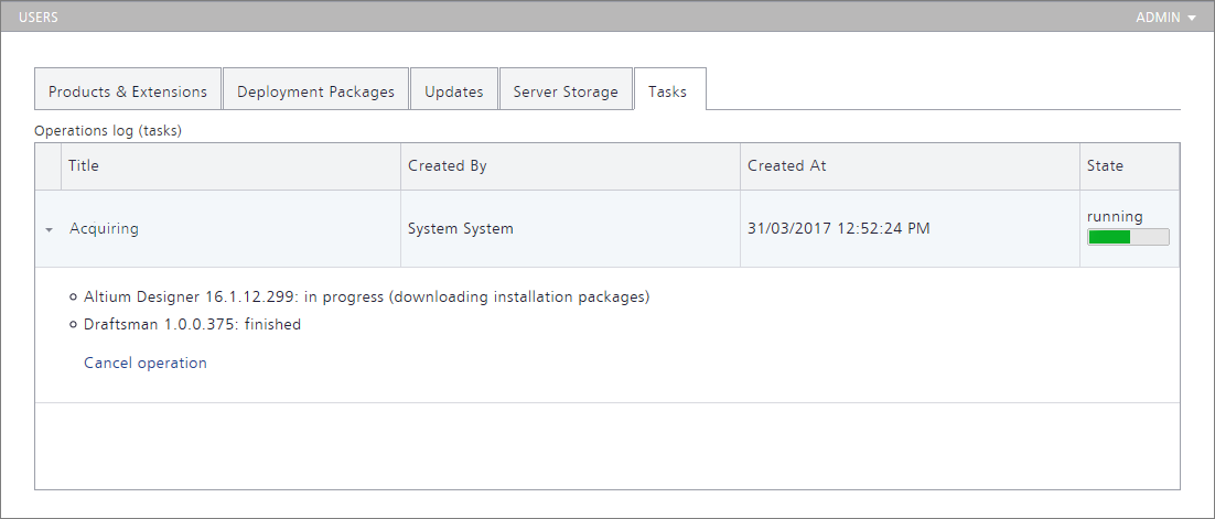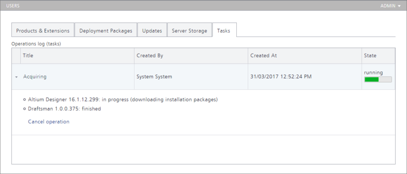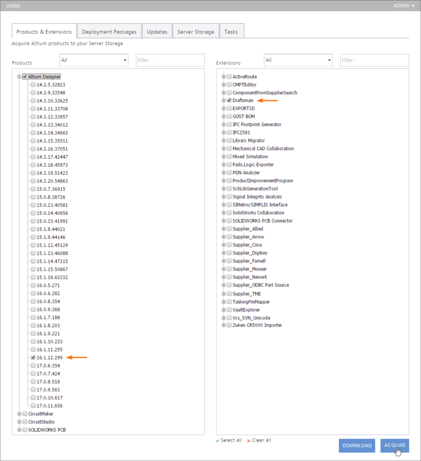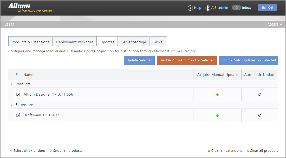 button, or check its Automatic Update box to allow to Server to automatically acquire the latest version, when available. The automated update check and acquisition process will occur at the interval specified under Network Installation in the ADMIN » SETTINGS page. In the example shown here where only Altium Designer 16.1 has been acquired, the Updates list will show the latest available version of Altium Designer and the latest compatible version of the Draftsman extension.