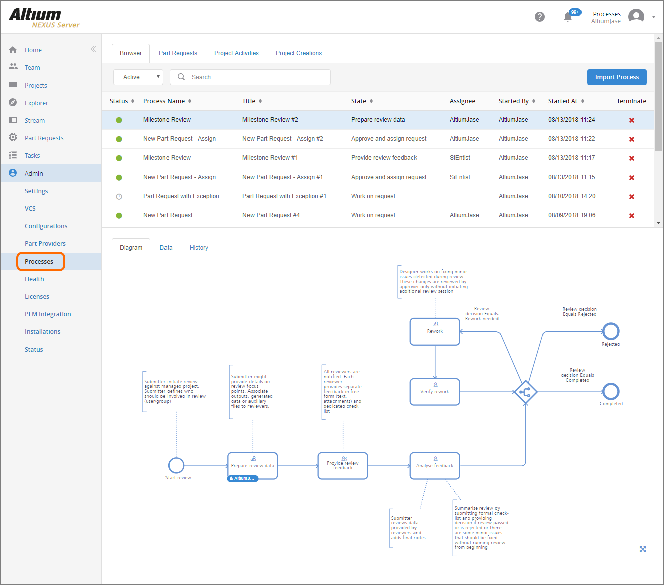 Processes, and their Workflows, are created and managed through the Altium NEXUS Server's browser-based interface - by an Administrator of that Server. For the three design areas mentioned previously, predefined process workflows are included with your Server installation. Some of these are activated for use out-of-the-box. Use these, modify them, or create your own as required, to suit the needs of your company. Others are samples - these cannot be activated and used as is. Each of these is therefore more like a 'template' - edit to suit your company's requirements, name, and save as a new process definition, which you can then activate and use, along with all other definitions.
