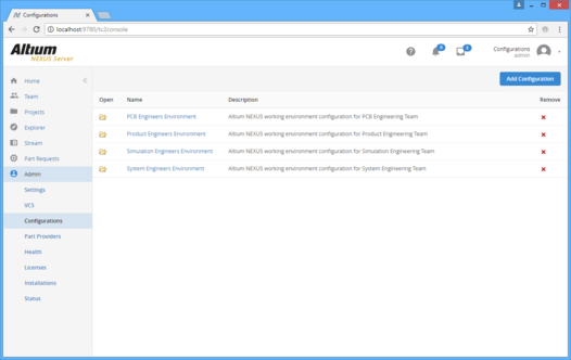 Any number of environment configurations may be defined through the Center's dedicated browser-based interface. The data used and enforced by each configuration - referred to as Configuration Data Items - are sourced from the Altium NEXUS Server. And by associating each environment configuration with a specific user role, and in turn assigning users to those roles, the correct working environment is loaded into Altium NEXUS as soon as the user signs in to the Altium NEXUS Server. Using this role-based approach ensures that a designer always gets the setup they are entitled to, no matter whether they have their own PC, or are sharing a single PC with fellow designers.
