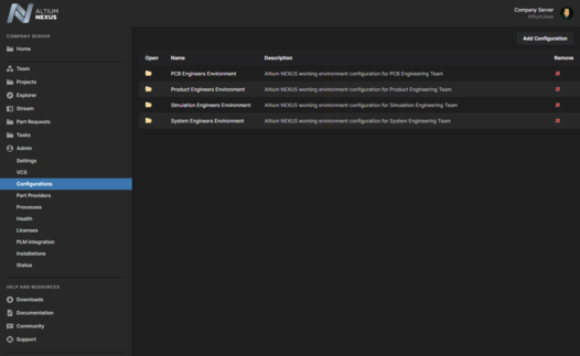Any number of environment configurations may be defined through the Center's dedicated browser-based interface. The data used and enforced by each configuration - referred to as Configuration Data Items - are sourced from the NEXUS Server. And by associating each environment configuration with a specific user role, and in turn assigning users to those roles, the correct working environment is loaded into Altium NEXUS as soon as the user signs in to the NEXUS Server. Using this role-based approach ensures that a designer always gets the setup they are entitled to, no matter whether they have their own PC, or are sharing a single PC with fellow designers.