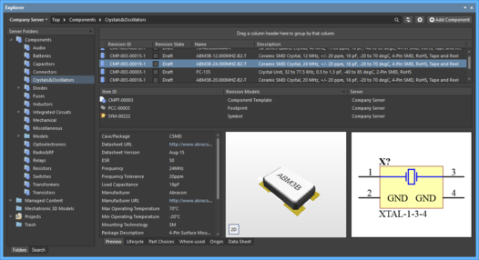 From within Altium NEXUS, component management is streamlined through use of the Components panel and Manufacturer Part Search panel. However, another interface to your server is the Explorer panel. From this panel you can perform many activities, including: