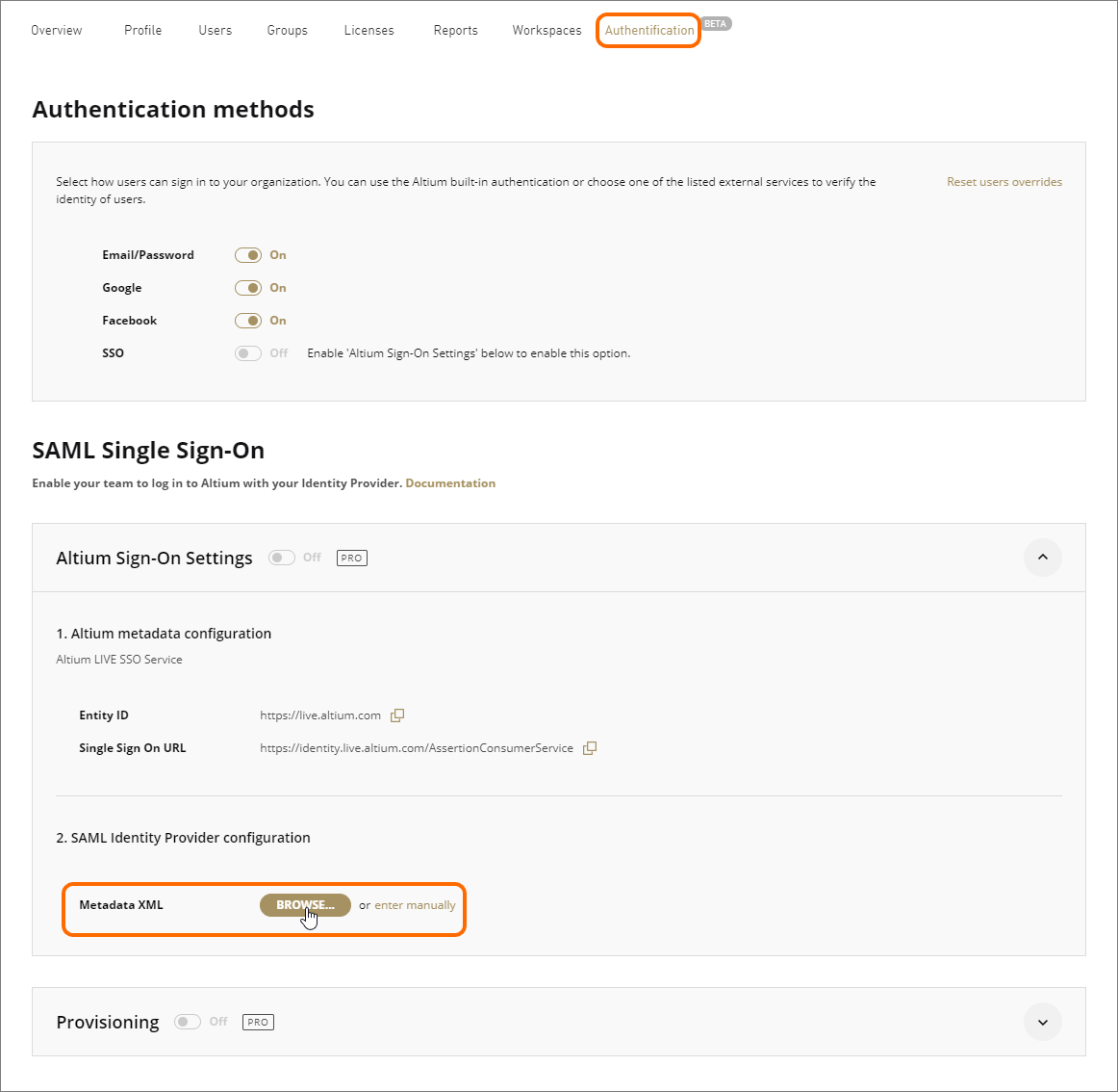 In its default state the Dashboard Authentication page shows the preconfigured URLs for the AltiumLive SSO service (1. Altium metadata configuration), and the option to upload or manually enter your IdP's authorization connection data (2. SAML Identity Provider Configuration).