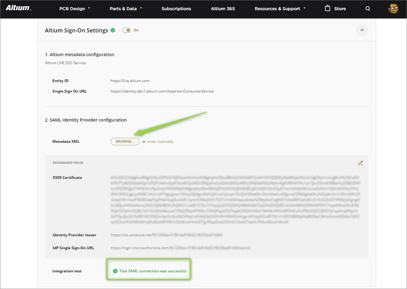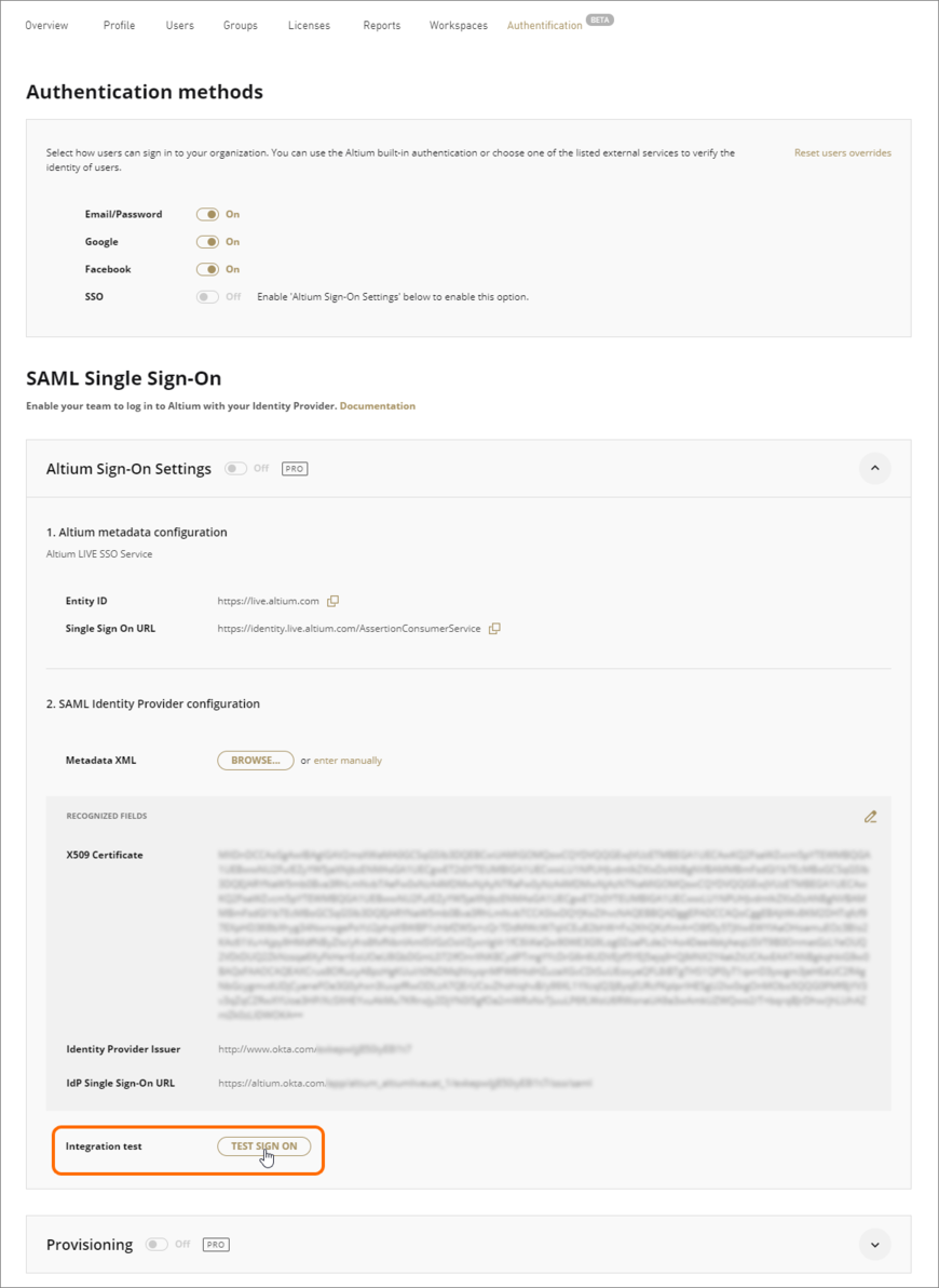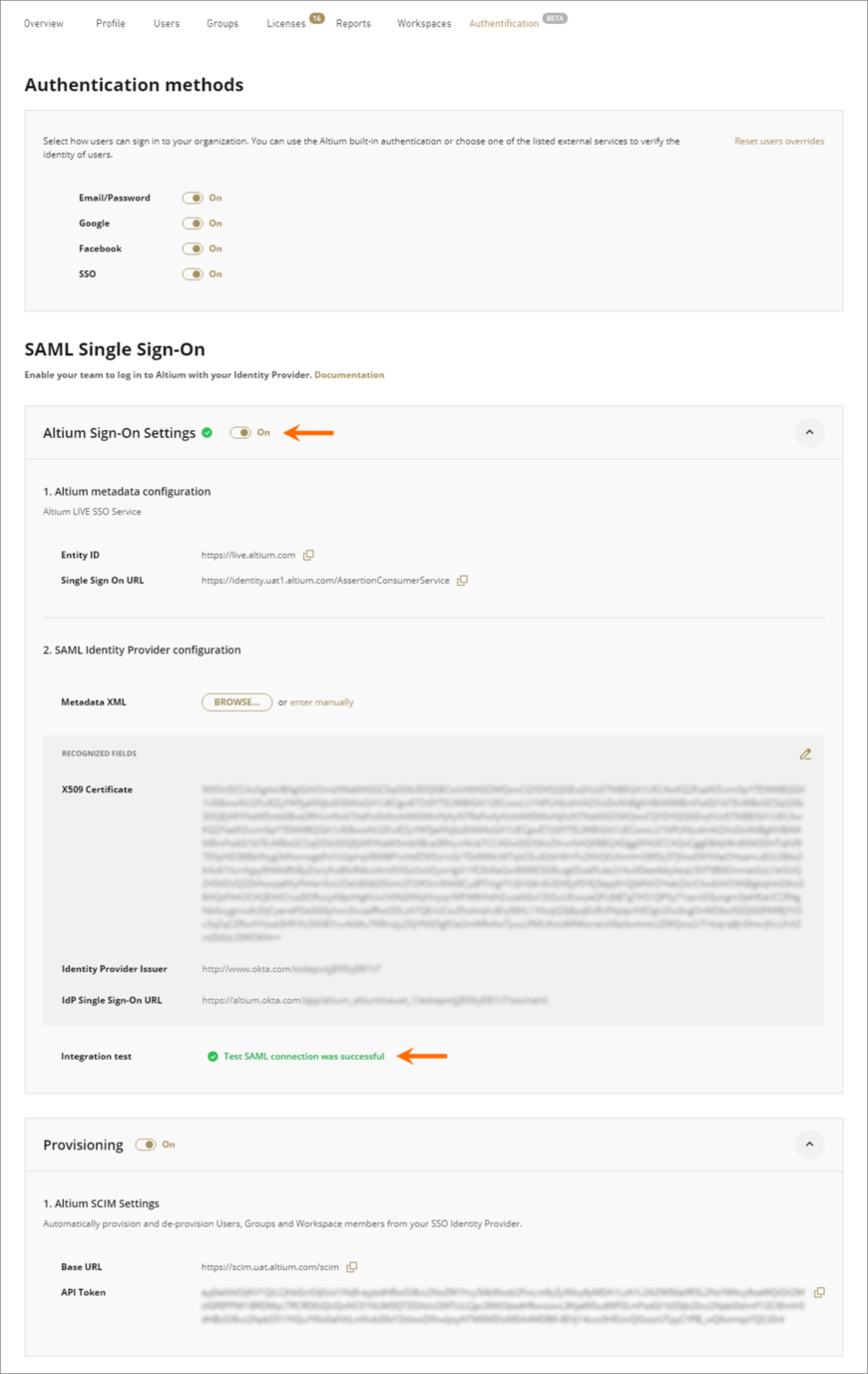 Back in the Authentication page, the configuration validity check is reported as successful and the Altium account's Single Sign-On capability can be enabled (