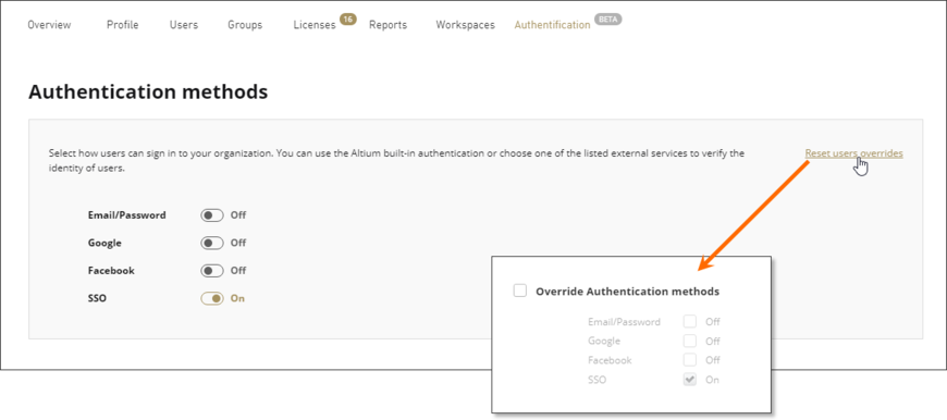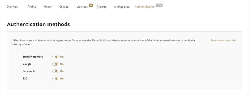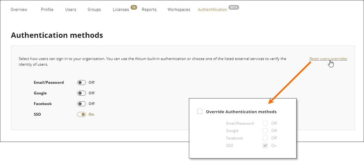 Individual user sign-in methods that have been specified with the Override Authentication methods settings (as above) can be restored to their defaults with the Reset users overrides option in the Authentication methods section of the Authentication page. This will reset the individual sign-in settings for all users to the global authentication methods that are currently selected on the Authentication page.
