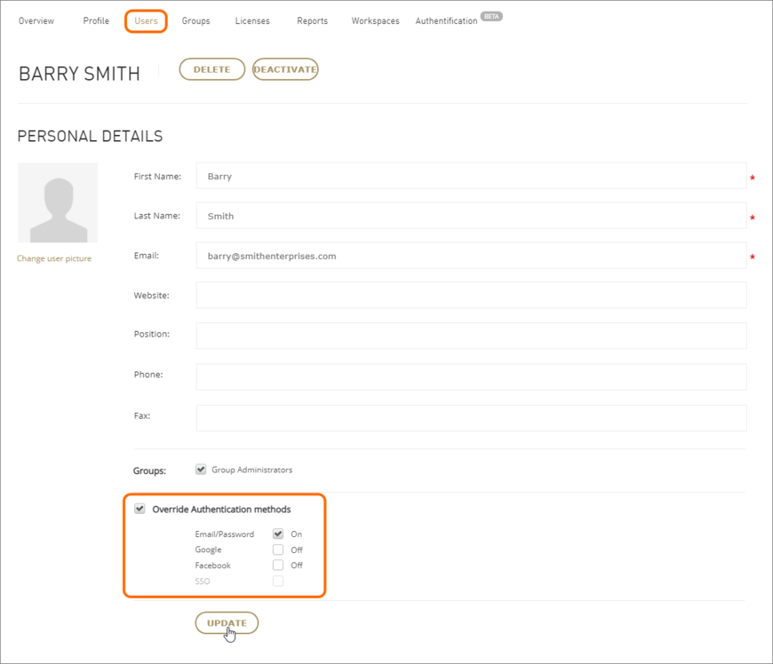 Sign-in options can be configured for an individual user from within their Dashboard account entry, accessed from the Dashboard Users page. These settings, when activated by checking the Override Authentication methods option, will take precedence over the global sign-in settings on the Authentication page for this user only. Click the