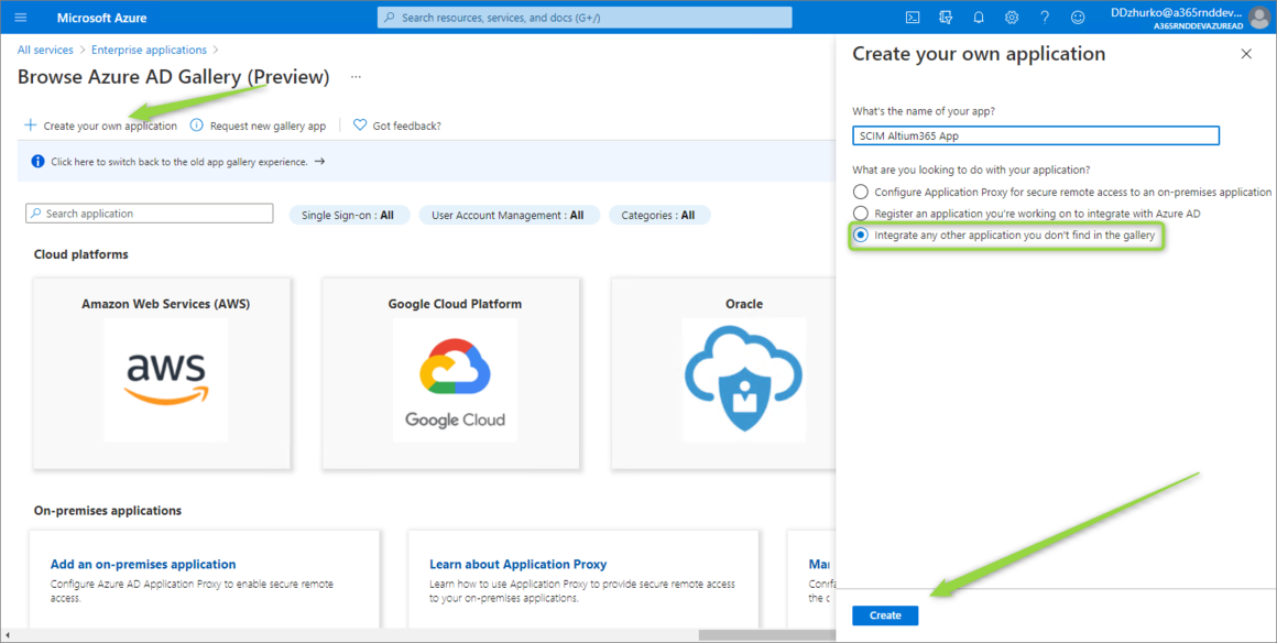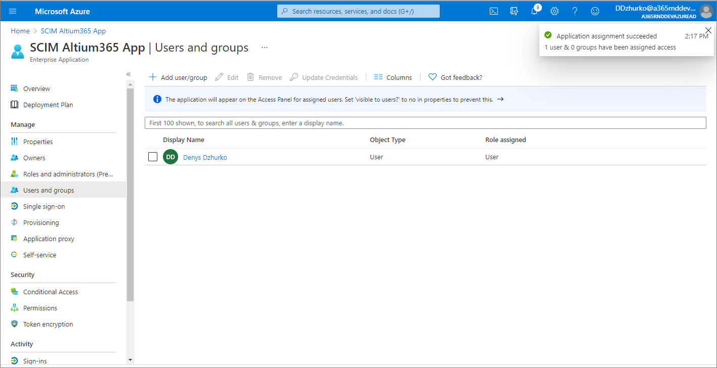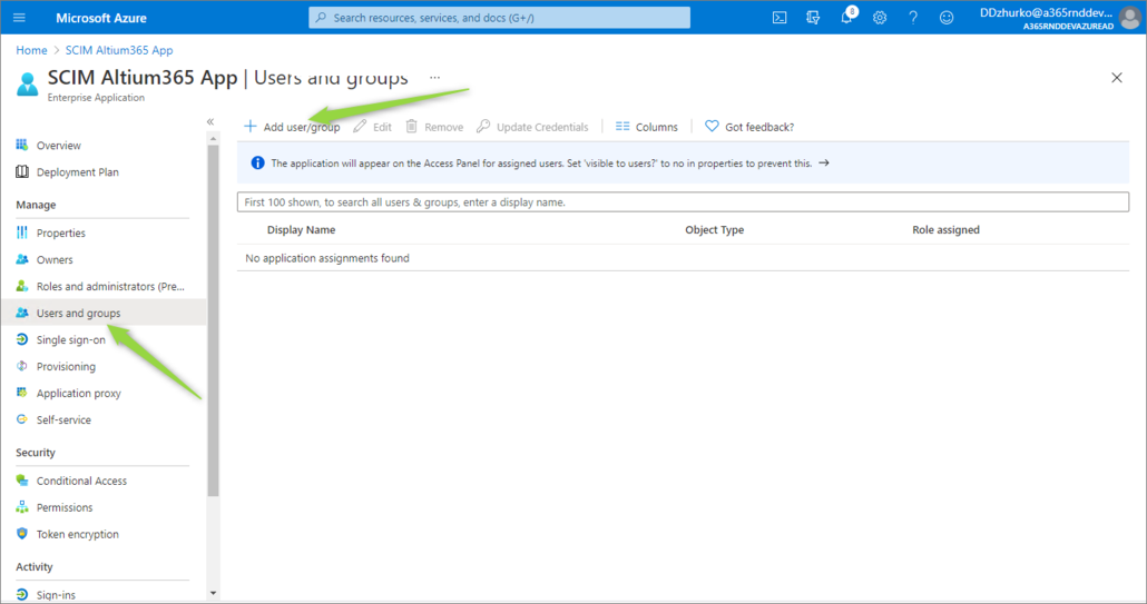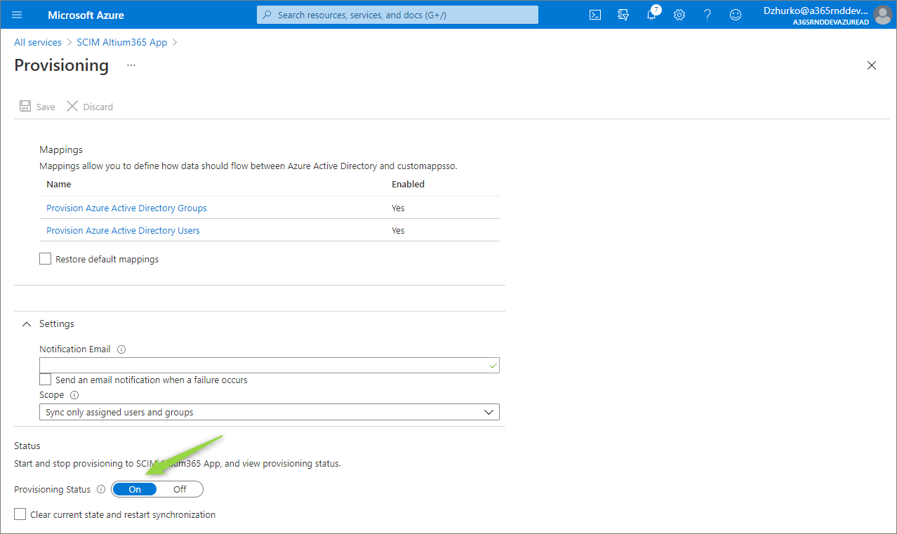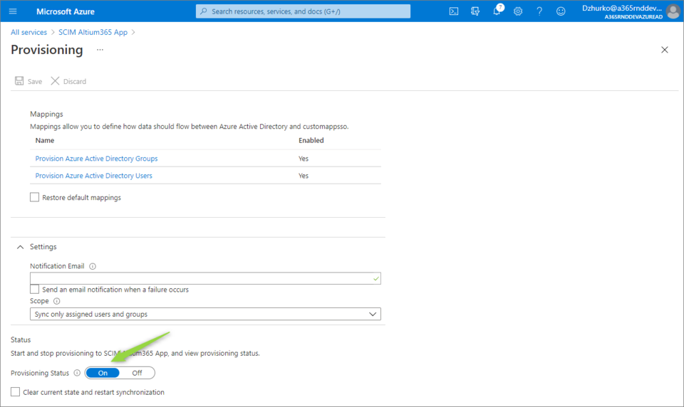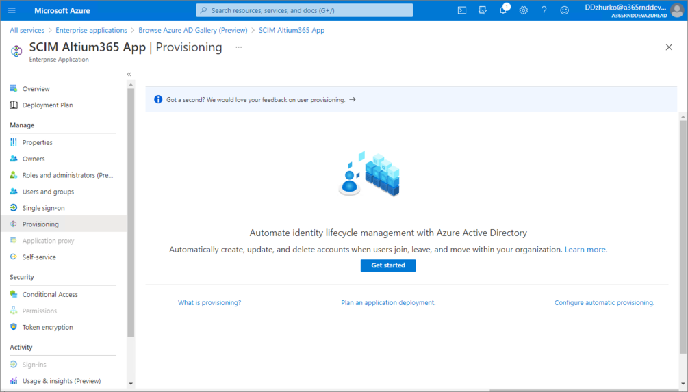 1. In the Azure app management screen, select Provisioning in the left panel and then the Get started button.