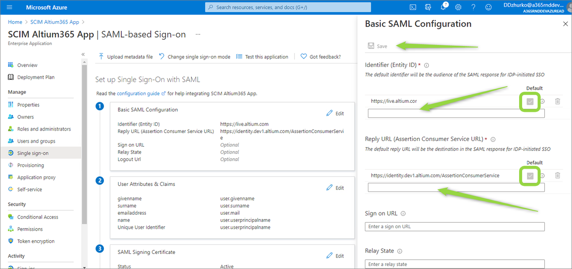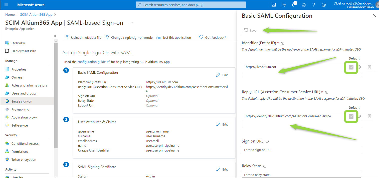 7. Paste the copied strings into the Entity ID and Assertion Consumer Service URL fields in the Azure App Save area. Make sure the Default boxes are checked for these fields, and then save the configuration.