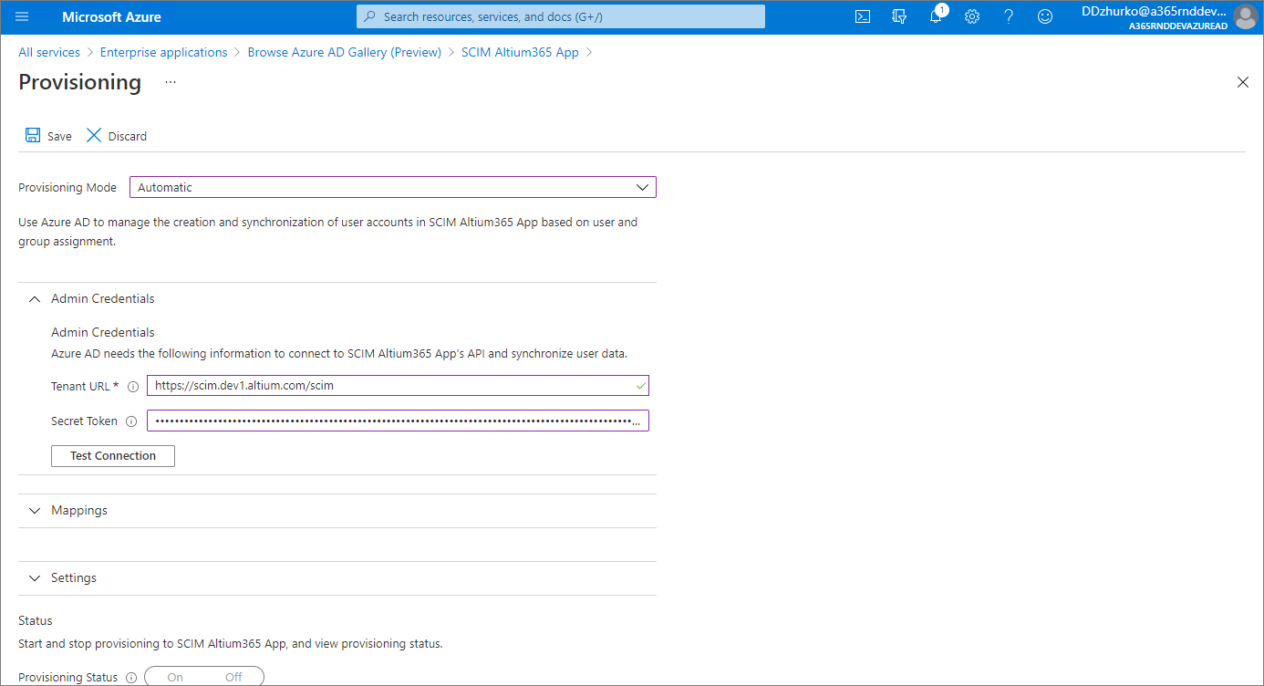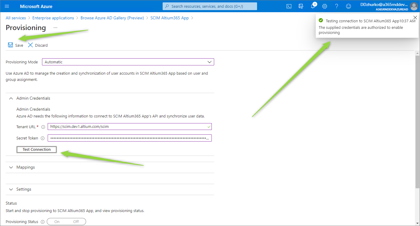5. Click the Azure Provisioning Test Connection button, and if the credentials are successfully authorized, Save the configuration.