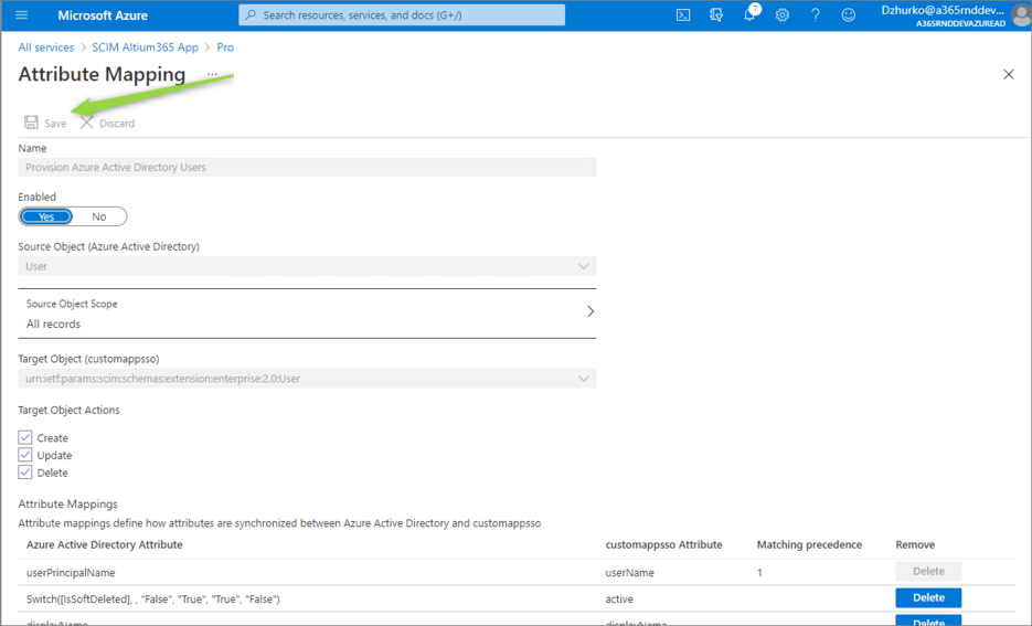 7. Select each mapping to review the attributes that ar8. e synchronized from Azure Active Directory to your app. The attributes selected as Matching properties are used to match the users and groups in your app for update operations. Select Save to commit any changes.
