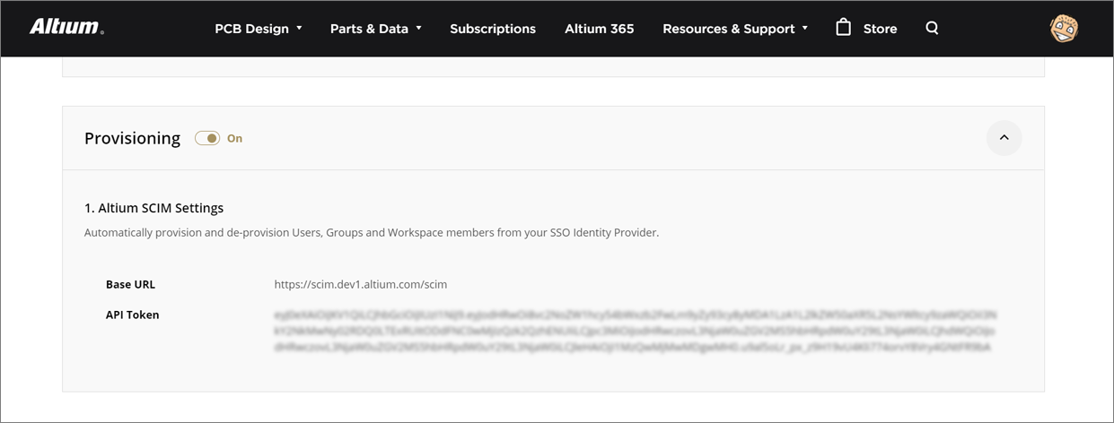 The Altium Dashboard Authentication page allows account Administrators to configure and enable Single Sign-On (SSO) capabilities for your AltiumLive account, and includes support for SCIM (System for Cross-domain Identity Management) user and group provisioning, which automates the exchange of identity data between your company and its Identity Provider (IdP).