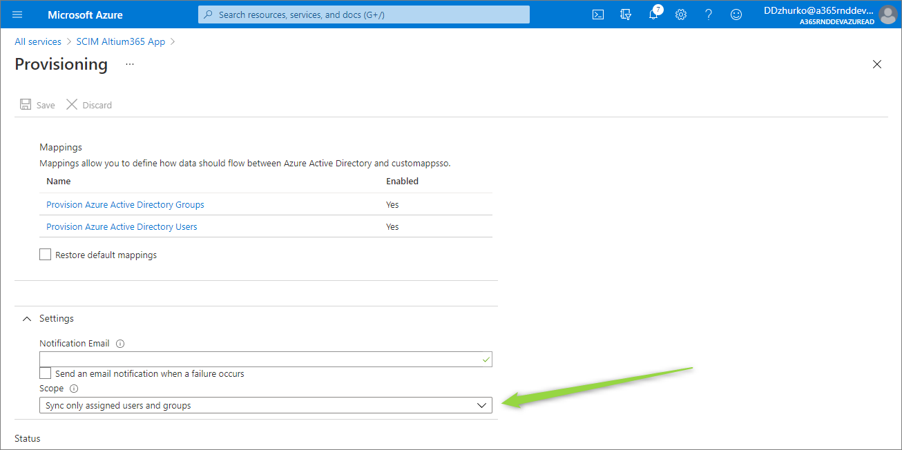 8. Under Settings, the Scope field defines which users and groups are synchronized. Select Sync only assigned users and groups (recommended) to only sync users and groups assigned in the Users and groups page.