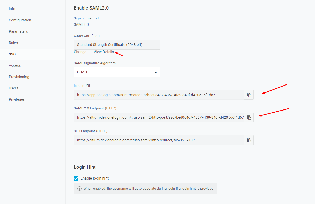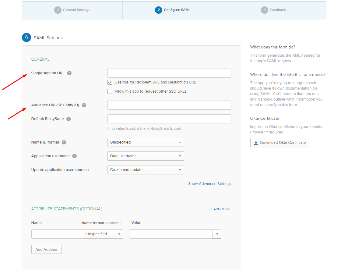 ) Entity ID and Single Sign On URL from the Dashboard Authentication page.