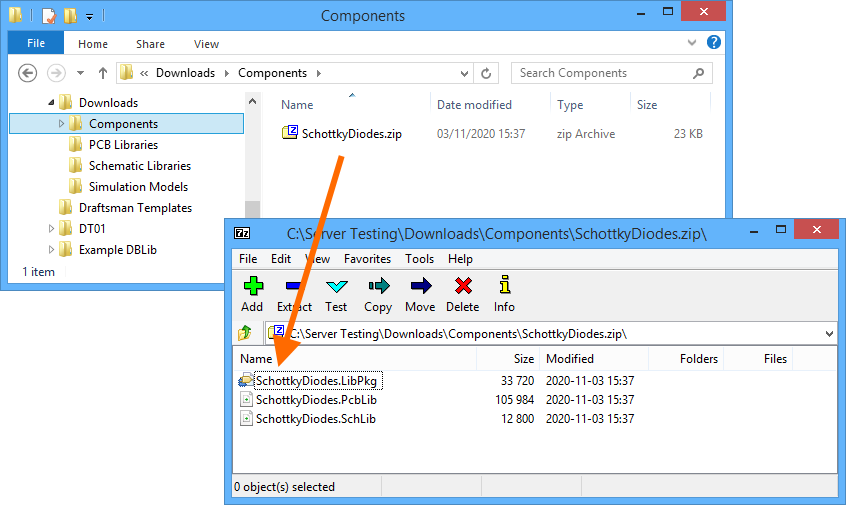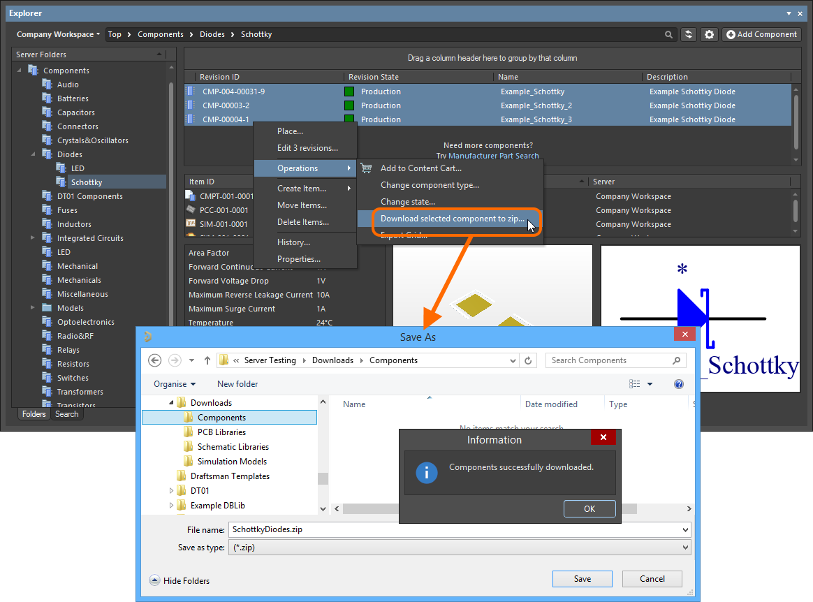 - Components – with the selected components downloaded into a Zip archive file containing source symbol and model libraries, and a source Integrated Library Package (