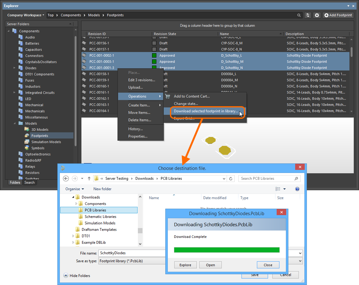 The Explorer panel in Altium Designer supports the ability to select multiple Items in your connected Workspace and have the source entities for those Items downloaded, en masse, into a newly created single source library or folder, as applicable. The following Item types are supported by this feature: