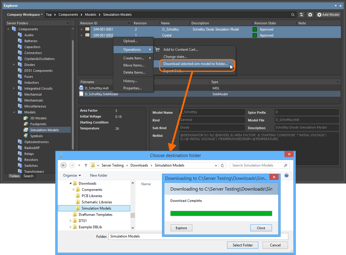- Right-click on the selection and choose the Operations » Download selected sim model to folder command.