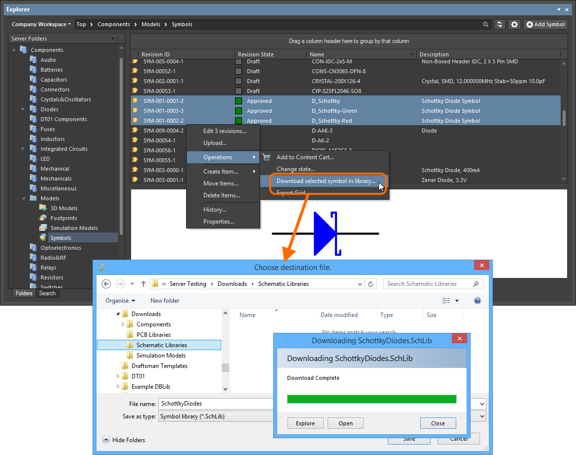 - Symbols – with the selected symbols downloaded into a Schematic Library (