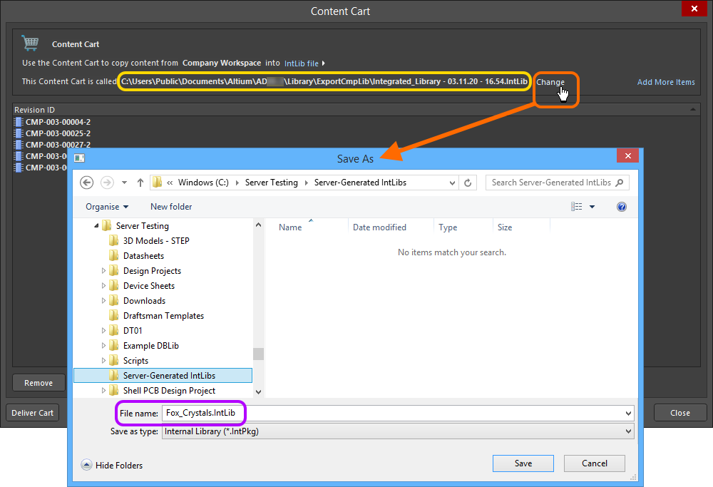 Specify the name, and location, for the generated IntLib file. By default, the file will be named in the format Integrated_Library - <Date> - <Time>.IntLib, and generated in the location \Users\Public\Documents\Altium\AD<Version>\Library\ExportCmpLib. Modify this as required through the Save As dialog – accessed by clicking the Change link.