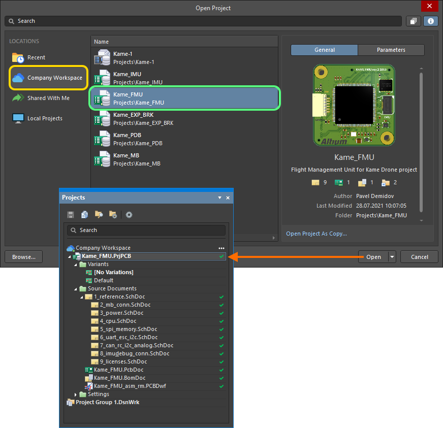 Obtain a local copy of a project by opening it (essentially checking it out of your connected Workspace). Shown here is an example of opening a project from a connected Altium 365 Workspace. Hover the cursor over the image to see an example of opening a project from a connected Concord Pro Workspace.