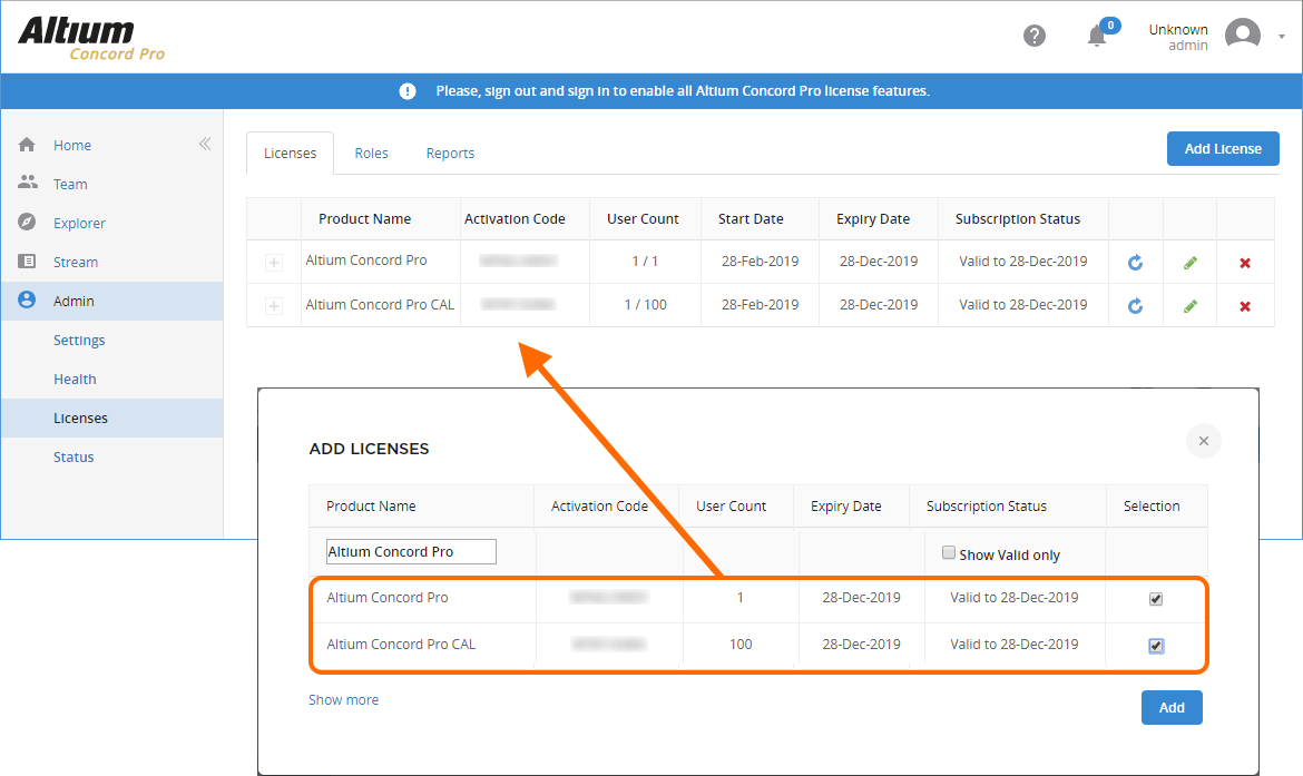 Licensing for Altium Concord Pro can be handled through the cloud, or locally through license files (*.alf). Licensing is managed by an administrator of your Concord Pro instance, on the Licenses page of Concord Pro's browser-based interface.