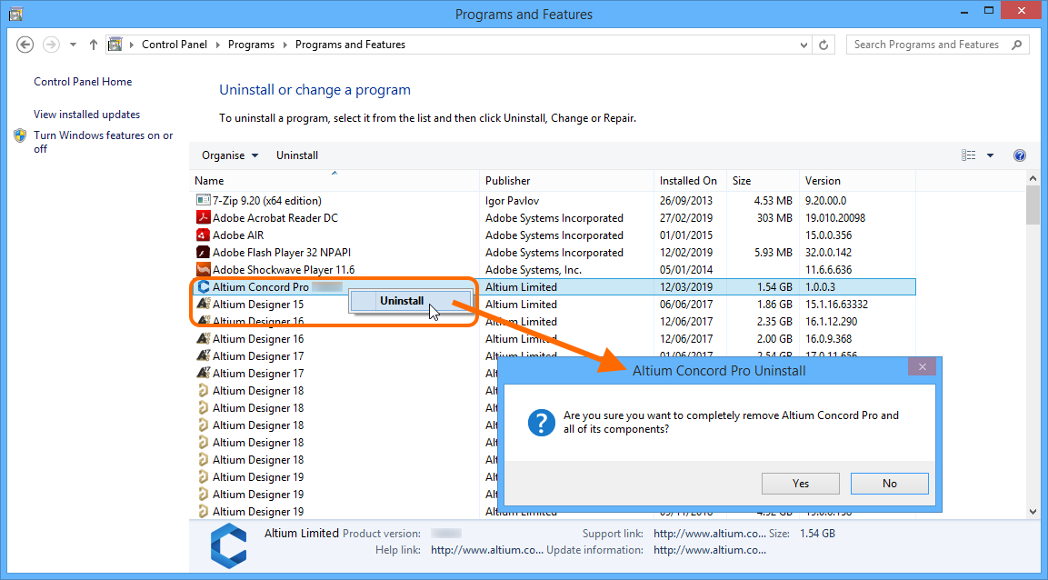 Uninstalling Altium Concord Pro is performed from the standard Programs and Features page (accessed from the Control panel in Windows). Right-click on the entry for Altium Concord Pro <VersionNumber> and use the Uninstall command from the context menu. A couple of dialogs will appear, in turn, asking: