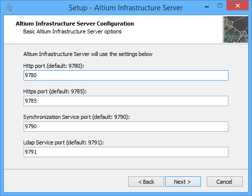 Use this next page of the wizard to specify the port numbers to be used by the Altium Infrastructure Server for network connections. The defaults are: