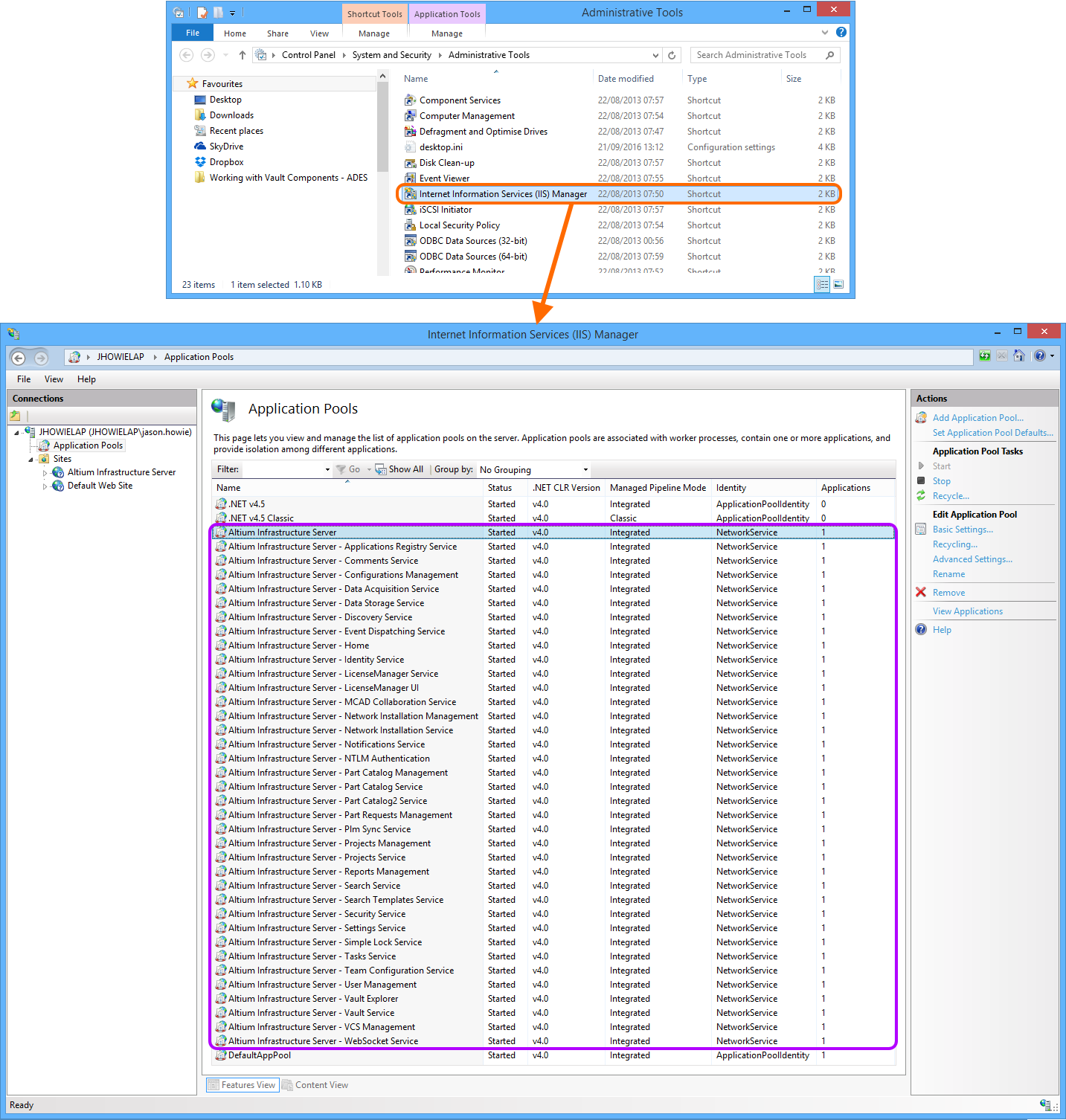 Verification that the Altium Infrastructure Server is running can be performed from the Windows Internet Information Services (IIS) Manager panel - accessed from Window's Administrative Tools window. Simply check to confirm the Altium Infrastructure-related Application Pools are in the Started state.