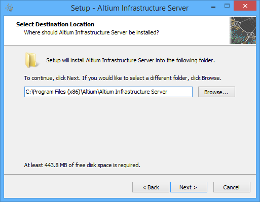 This next page of the wizard allows you to specify the destination in which to install the Altium Infrastructure Server. The default installation path is \Program Files (x86)\Altium\Altium Infrastructure Server. The Altium Infrastructure Server requires at least 444MB of free disk space for installation.