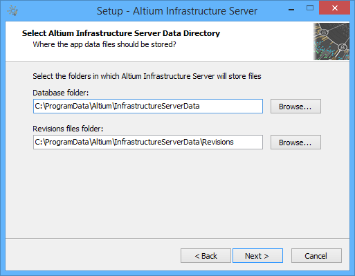 \ProgramData\Altium\InfrastructureServerData\ProgramData\Altium\InfrastructureServerData\RevisionsTo specify an alternate location, simply type the location directly into a field, or click the Browse button at the right of a field, and browse for the required destination folder (or create it on-the-fly).