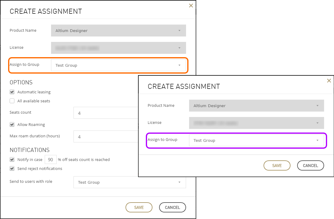 Assigning the license to the required group for an On-Demand license (back) and Standalone license (front).