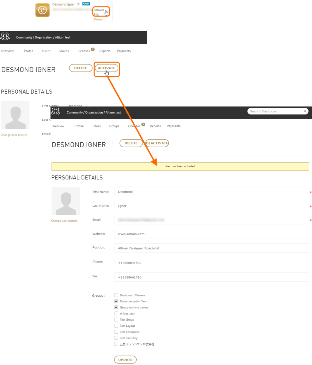 Activation of the user will send an email to that user with a new (reset) temporary password, so that they can once again sign into the account from within Altium Designer, and access applicable licenses available to them, and once again access the AltiumLive community.