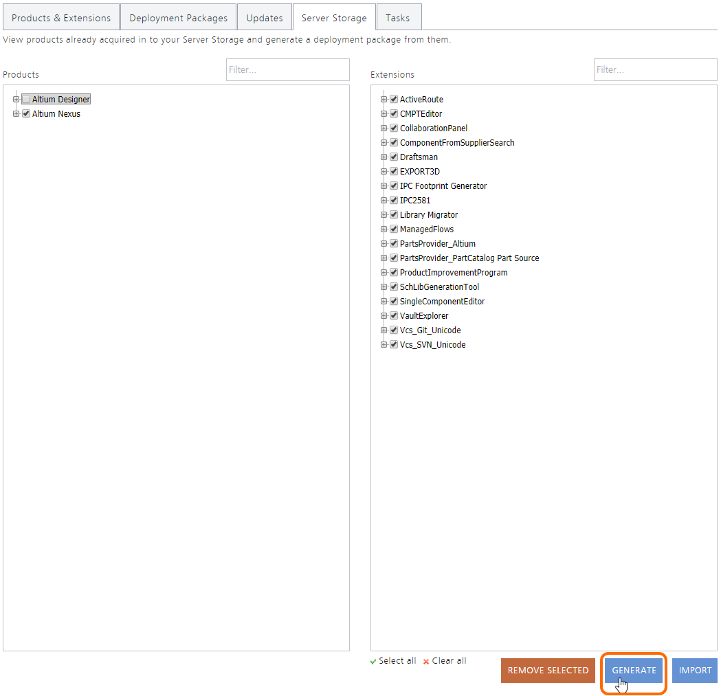 With the products and extensions resident in your local Altium Infrastructure Server, you are now free to build one or more deployment packages, for use in the wider company. This can be initiated from the Server Storage tab by selecting the required product and extension(s) and clicking the