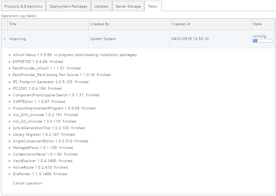 You may be wondering who System System is, in the Created By cell for tasks such as Acquiring and Packaging. This is simply one of the two default software-generated users (the other being admin admin) for the local Altium Infrastructure Server, created to be used for tasks such as these.