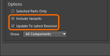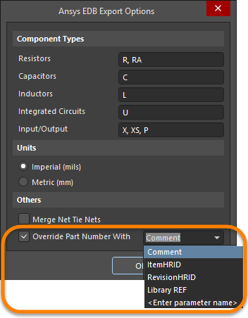 An 'Override Part Number With' option was added to the Ansys EDB Export Options dialog. This new option allows you to specify which parameter should be used as a Local Part Name rather than using 'Comment'