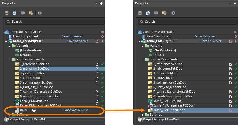 A 'virtual' BOM item is added to the project in the Projects panel if there is at least one component in the project. You can open, save or remove the BOM item. The basic flow of BOM generation will not be impacted by the virtual BOM item. Click +Add ActiveBOM in the panel to open the virtual BOM in preview mode. Once the new *.BomDoc has been saved it will become a standard project document. If the virtual