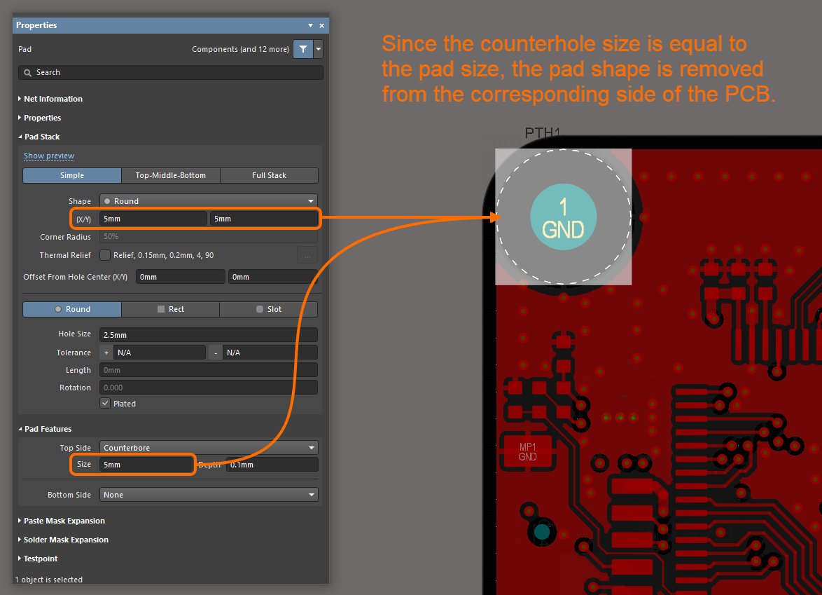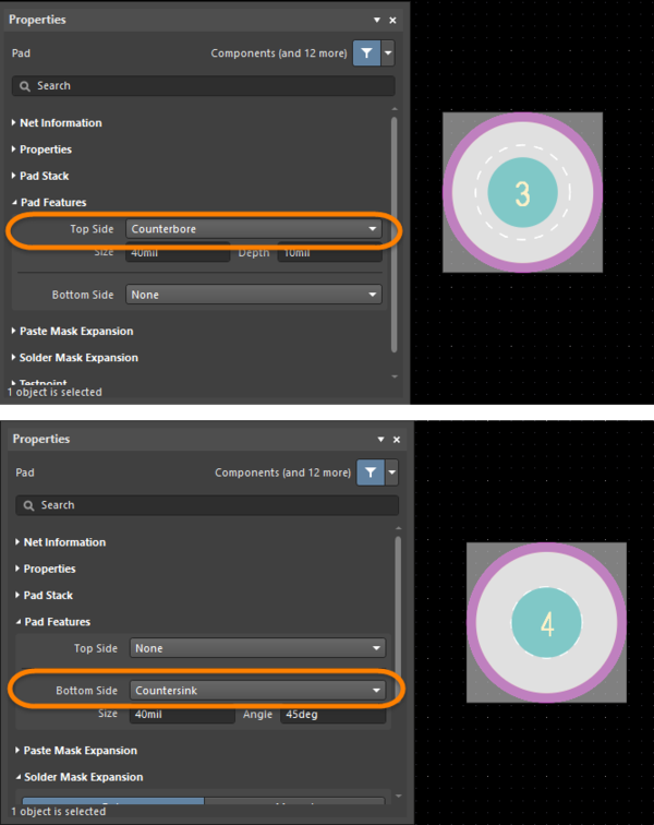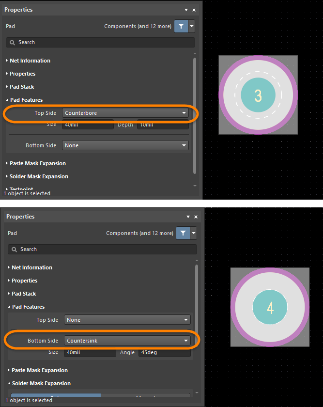 Use the new options in the Pad mode of the Properties panel to choose the type of counterhole desired. A dashed line appears around the pad in 2D to define the counter hole contour on the active layer as shown in